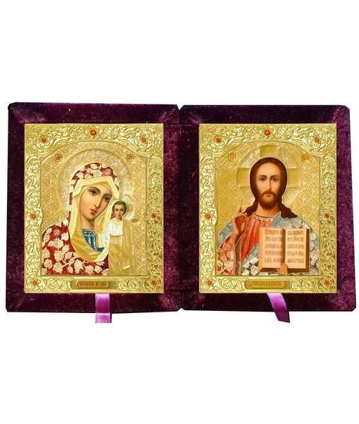 Бархатный складень вынимающийся лик 15х18 Софрино цветная одежда Б-21-3-Б с золотым окладом, замочком и вышитым крестиком по средине, 36х21х6 см