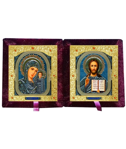 Бархатный складень вынимающийся лик 15х18 Софрино узор Б-21-4-Б с золотым окладом, замочком и вышитым крестиком по средине, 36х21х6 см