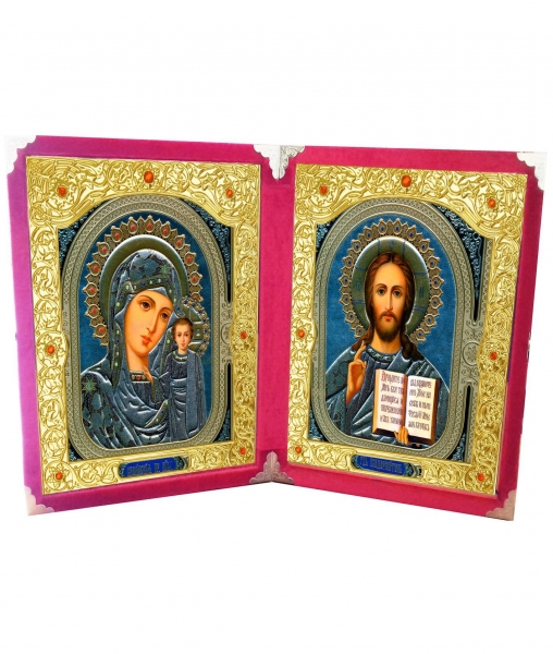 Бархатный складень вынимающийся лик 15х18 Софрино узор Б-21-К-4-К с коваными уголочками, золотым окладом, замочком и вышитым крестиком по средине, 36х21х6 см