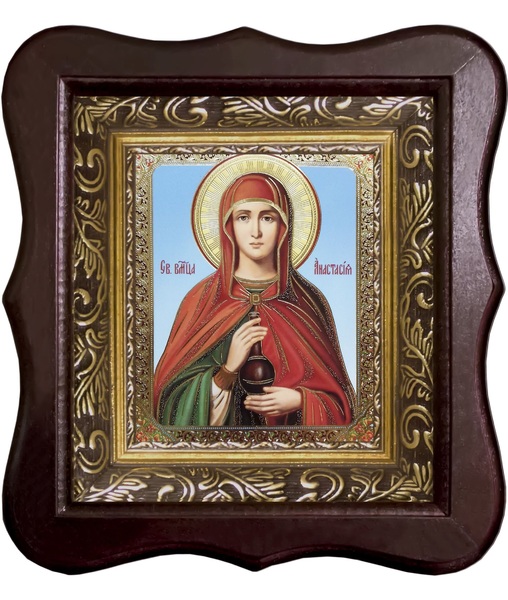 Икона Анастасия Фигурный деревянный светлый киот размером 130х260х40 мм, со стеклом. Внутри багетная рамка с ОБЬЕМНЫМ -3 D лик 15х18см :