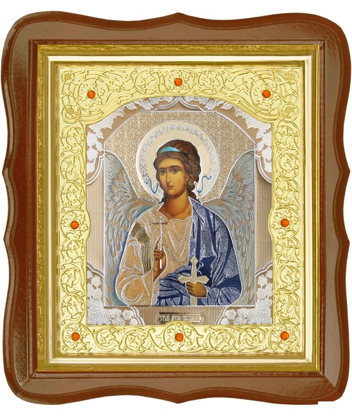 Икона Ангела Хранителя 20-ФС-1 26х29 см деревянный фигурный светлый киот, лик 15х18 поясной Софрино белая одежда, оклад (риза) золото