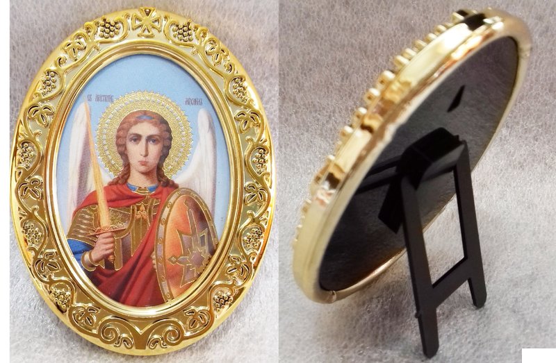 58х75х7 мм, овальный золотой киот с серебрянным окладом, лик 5х8, со стеклом на подставке