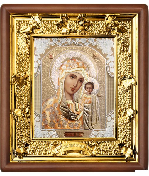Икона Богородица Казанская 31-П-8 24х27 см деревянный прямой киот, лик 15х18 Софрино жёлтая одежда, оклад (риза) золото