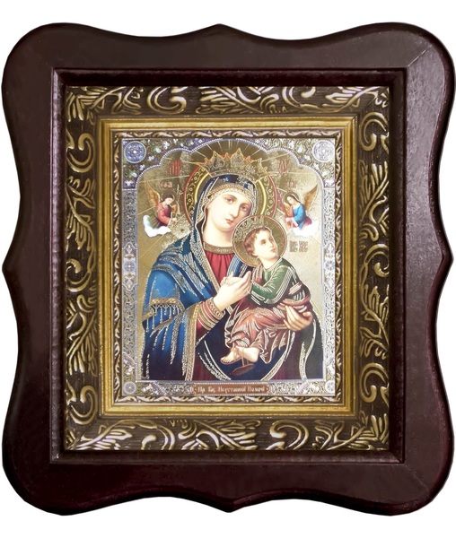 Икона Богородица Всепомогающая(страстная) Фигурный деревянный светлый киот размером 130х260х40 мм, со стеклом. Внутри багетная рамка с ОБЬЕМНЫМ -3 D лик 15х18см :