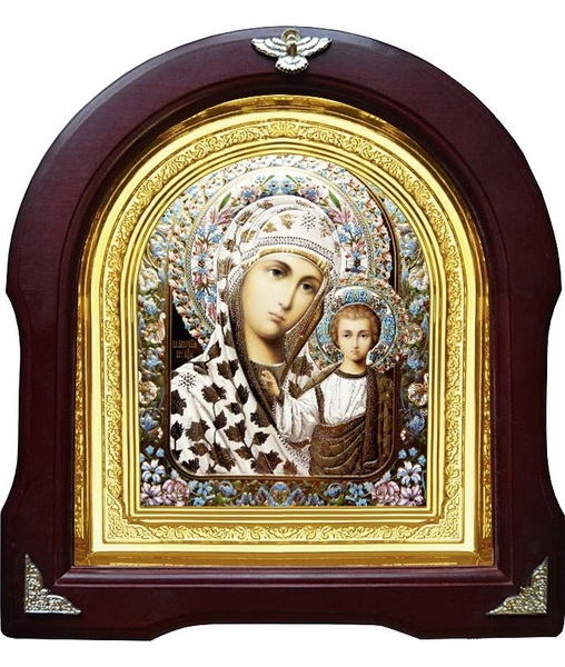 Икона Богородицы Казанской 12-А-188 в подарочной упаковке 26х29 см деревянный арочный киот, лик 15х18 эмаль №2, оклад (риза) золото