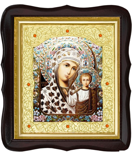 Икона Богородицы Казанской 20-ФТ-188 26х29 см деревянный фигурный тёмный киот, лик 15х18 эмаль №2, оклад (риза) золото