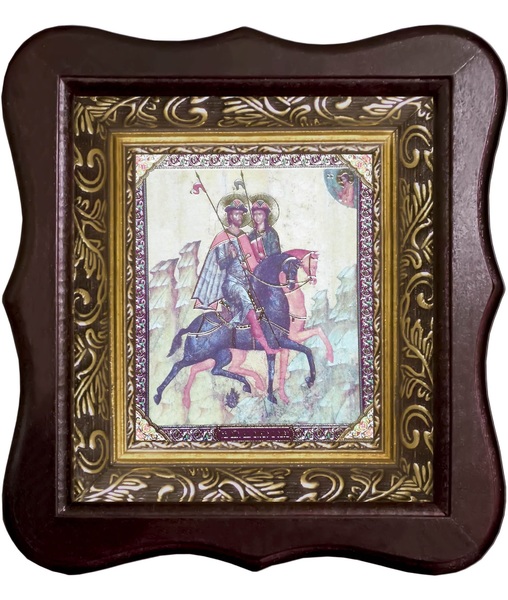 Икона Борис и Глеб Фигурный деревянный светлый киот размером 130х260х40 мм, со стеклом. Внутри багетная рамка с ОБЬЕМНЫМ -3 D лик 15х18см :