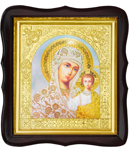 Икона Божьей Матери Казанской 17-ФТ-195 26х29 см деревянный фигурный тёмный киот, лик 15х18, оклад (риза) золото