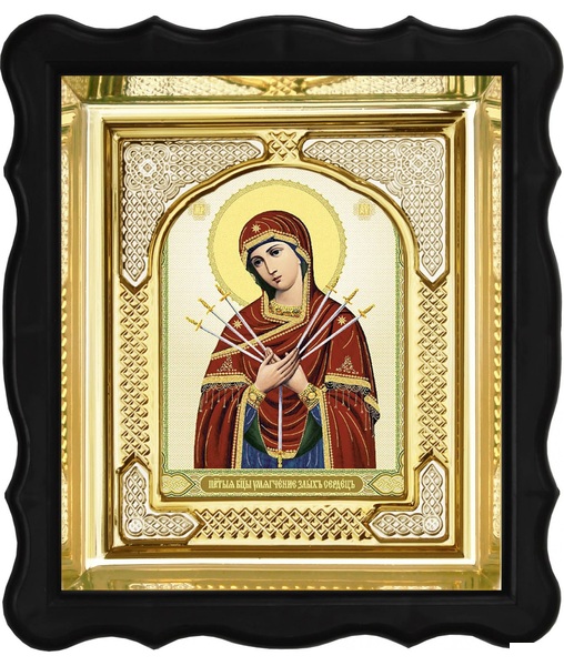 Икона Божией Матери Умягчение злых сердец 3-ФП-64 17х19 см фигурный пластиковый киот, лик 10х12 Тропарь, оклад (риза) золото.