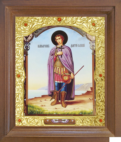 Икона Дмитрий Солунский рост. 25-П-321 12х14 см деревянный прямой киот, лик 10х12, оклад (риза) золото