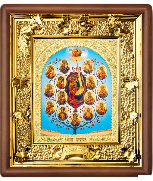 Икона Древо Богородицы 31-П-80 24х27 см деревянный прямой киот, лик 15х18 Софрино арочный, оклад (риза) золото