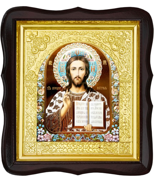 Икона Господь Иисус Христос 17-ФТ-189 26х29 см деревянный фигурный тёмный киот, лик 15х18 эмаль №2, оклад (риза) золото