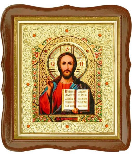 Икона Господь Иисус Христос 20-ФС-19 26х29 см деревянный фигурный светлый киот, лик 15х18 Софрино эмаль, оклад (риза) золото