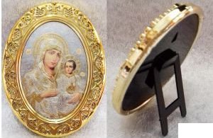 58х75х7 мм, овальный золотой киот с серебрянным окладом, лик 5х8, со стеклом на подставке