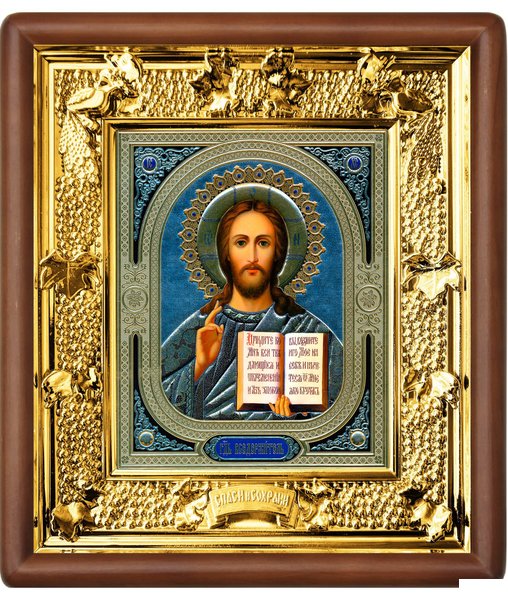 Икона Иисус Христос 31-П-18 24х27 см деревянный прямой киот, лик 15х18 Софрино узор, оклад (риза) золото