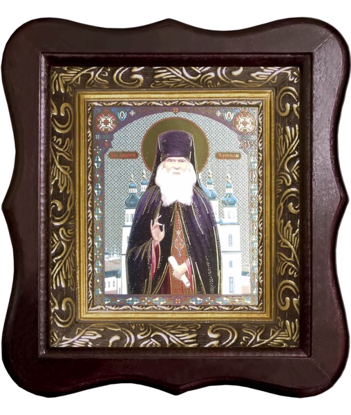 Икона Лаврентий Черниговский  Фигурный деревянный светлый киот размером 130х260х40 мм, со стеклом. Внутри багетная рамка с ОБЬЕМНЫМ -3 D лик 15х18см
