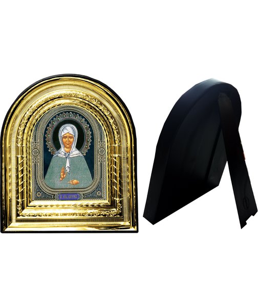 Икона Матрона Московская 32-ПЛ-38 15,5х17,5 см пластмассовый киот, лик 10х12 Софрино узор, оклад (риза) золото.