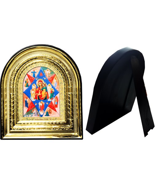 Икона Неопалимая Купина 32-ПЛ-41 15,5х17,5 см пластмассовый киот, лик 10х12 Софрино арочный, оклад (риза) золото.