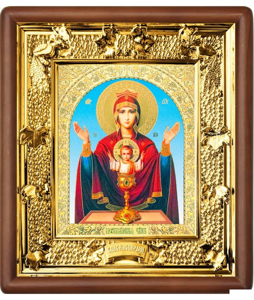 Икона Неупиваемая чаша 31-П-44 24х27 см деревянный прямой киот, лик 15х18 Софрино арочный, оклад (риза) золото