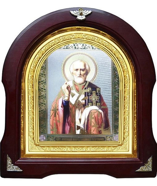 Икона Николай Чудотворец 12-А-170 в подарочной упаковке 26х29 см деревянный арочный киот, лик 15х18, оклад (риза) золото