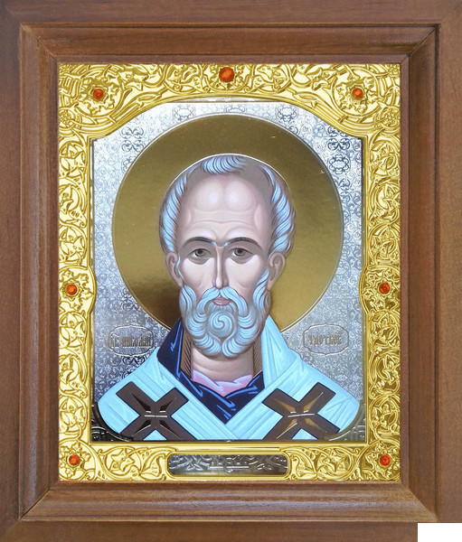 Икона Николай Чудотворец 26-П-173 17х20 см деревянный прямой киот, лик 15х18 Византия, оклад (риза) золото