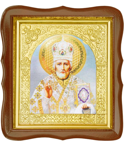 Икона Николая Чудотворца 17-ФС-197 26х29 см деревянный фигурный светлый киот, лик 15х18, оклад (риза) золото