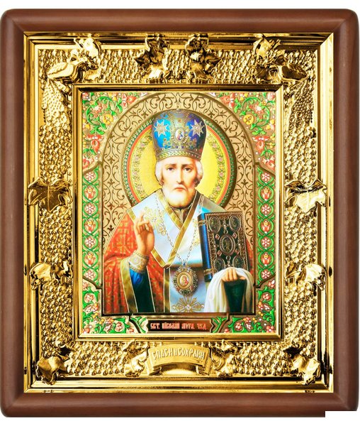 Икона Николая Чудотворца 31-П-175 24х27 см деревянный прямой киот, лик 15х18 Софрино эмаль, оклад (риза) золото