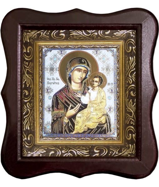 Икона Портаитисса, Иверская Божия Матери Фигурный деревянный светлый киот размером 130х260х40 мм, со стеклом. Внутри багетная рамка с ОБЬЕМНЫМ -3 D лик 15х18см