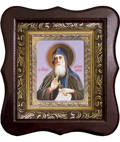 Икона Пребодобный Антоний Печерский Фигурный деревянный светлый киот размером 130х260х40 мм, со стеклом. Внутри багетная рамка с ОБЬЕМНЫМ -3 D лик 15х18см