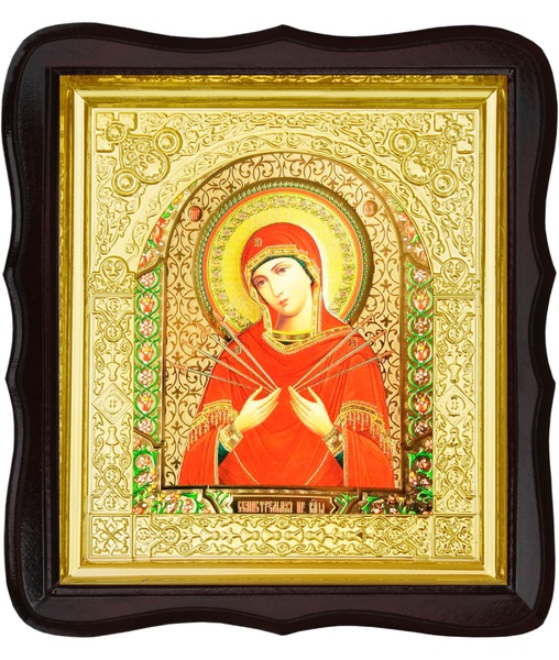 Икона Семистрельная Божья Матерь 17-ФТ-176 26х29 см деревянный фигурный тёмный киот, лик 15х18 Софрино эмаль, оклад (риза) золото