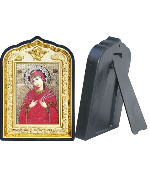 Икона Семистрельной Божией Матери 14-ПЛ-12 10х14 см пластмасовый киот, лик 6х9 Софрино цветная одежда, оклад (риза) золото