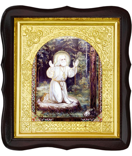 Икона Серафима Саровского на камне 17-ФТ-187 26х29 см деревянный фигурный тёмный киот, лик 15х18, оклад (риза) золото