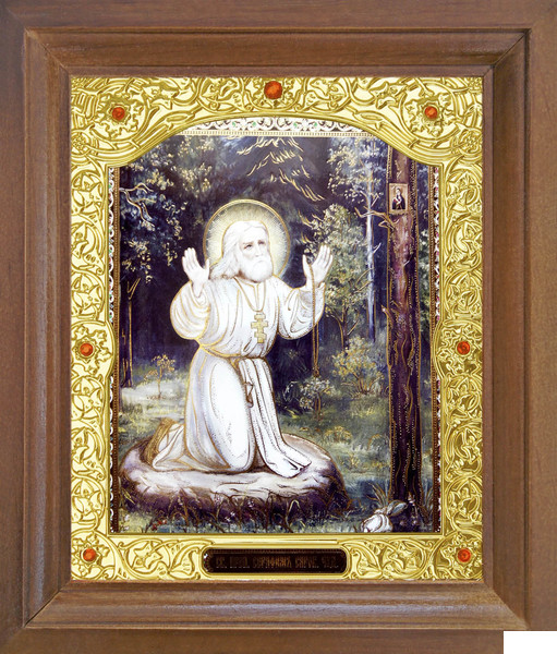 Икона Серафима Саровского на камне 26-П-187 17х20 см деревянный прямой киот, лик 15х18, оклад (риза) золото