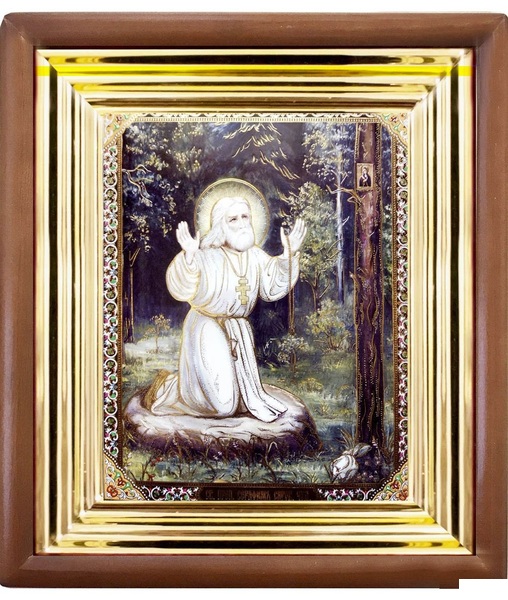 Икона Серафима Саровского на камне 27-П-187 22х25 см деревянный прямой киот, лик 15х18, оклад (риза) золото