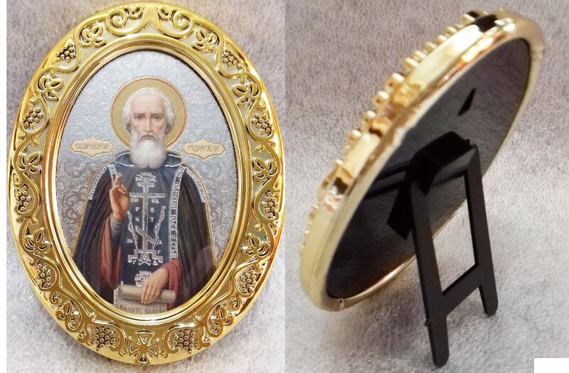 58х75х7 мм, овальный золотой киот с серебрянным окладом, лик 5х8, со стеклом на подставке