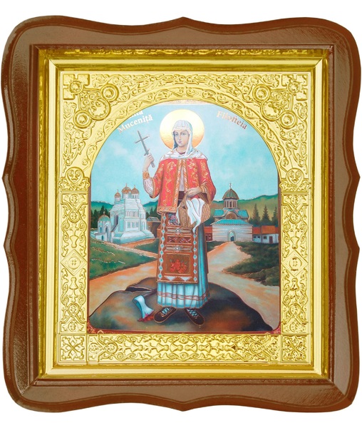 Икона Sfanta Mucenita Filofteia (Филофея) 17-ФС-185 26х29 см деревянный фигурный светлый киот, лик 15х18, оклад (риза) золото