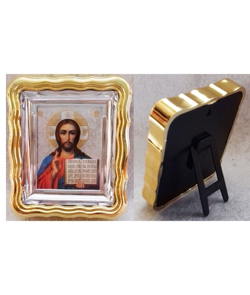 2062х72х13 мм, фигурный золотой киот с серебрянным окладом, лик 5х8, со стеклом на подставке