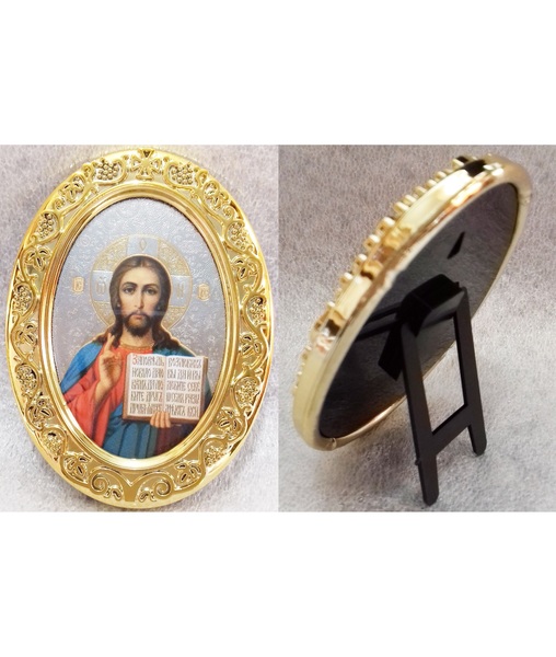 58х75х7 мм, овальный золотой киот с серебрянным окладом, лик 5х8, со стеклом на подставке