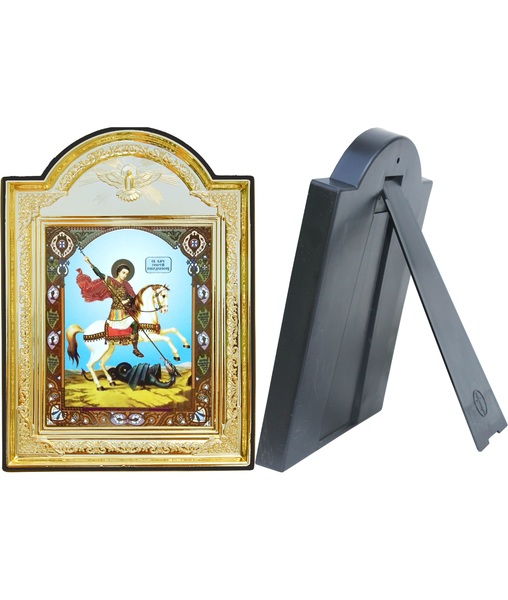 Икона Святой Георгий Победоносец на коне 8-ПЛ-310 13,5х18,5 см пластмасовый киот, лик 10х12, оклад (риза) золото.