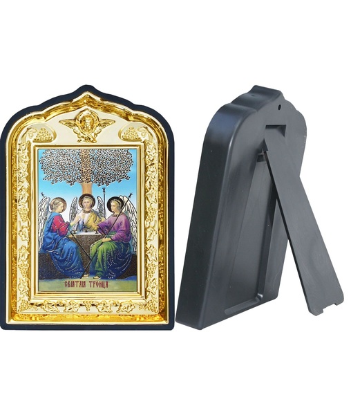 Икона Святой Троицы 14-ПЛ-13 10х14 см пластмасовый киот, лик 6х9 Софрино цветная одежда, оклад (риза) золото