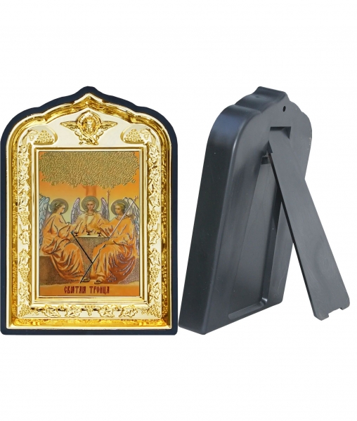 Икона Святой Троицы 14-ПЛ-8 10х14 см пластмасовый киот, лик 6х9 Софрино желтая одежда, оклад (риза) золото