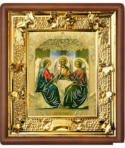 Икона Святой Троицы 31-П-60 24х27 см деревянный прямой киот, лик 15х18 Софрино цветная одежда, оклад (риза) золото