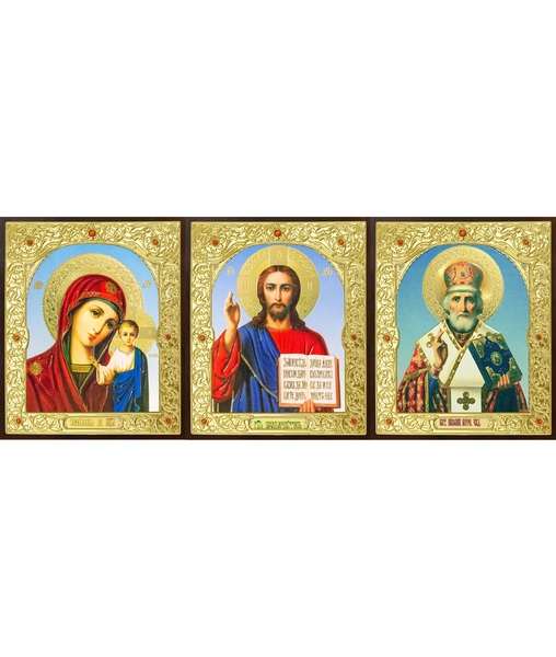Икона Тройник, лик Софрино арочный 24-Г-2 31х13 см деревянный прямой киот на подставке, лик 30х12 арочный Софрино, оклад (риза) золото