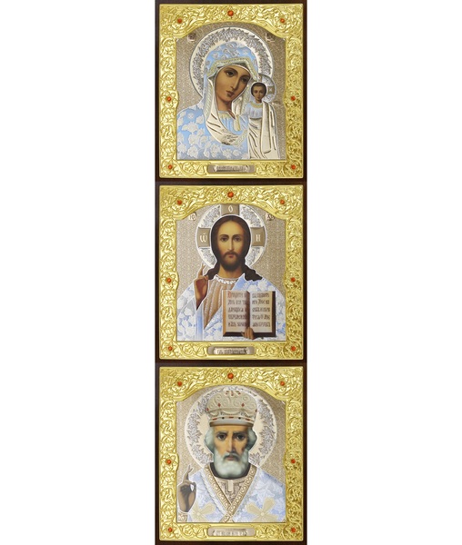 Икона Тройник, лик Софрино белая одежда 24-В-1 31х13 см деревянный прямой киот, лик 30х12 Софрино белая одежда, оклад (риза) золото
