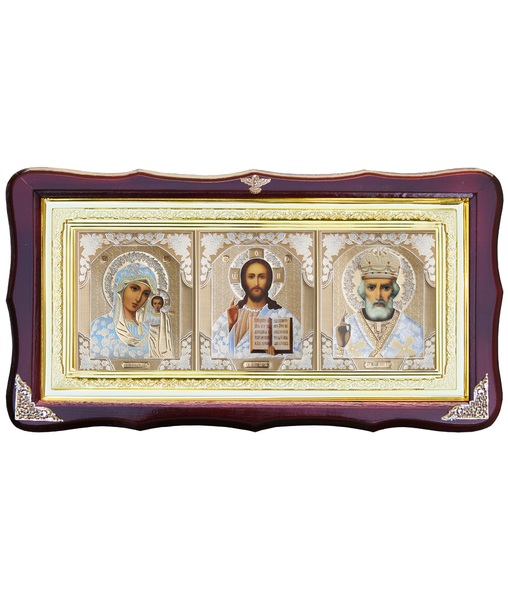 Икона Тройник, лик Софрино белая одежда, лик 30х12, арт. 15-Ф-1 39х21 см деревянный фигурный киот, лик 30х12 Софрино белая одежда, оклад (риза) золото.