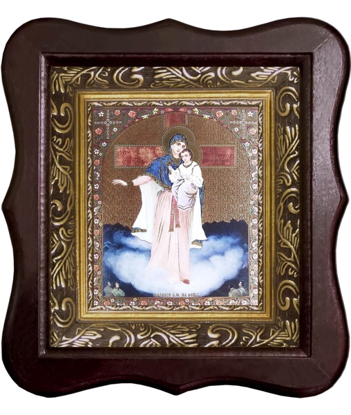 Икона Явление Божией Матери на войне Фигурный деревянный светлый киот размером 130х260х40 мм, со стеклом. Внутри багетная рамка с ОБЬЕМНЫМ -3 D лик 15х18см