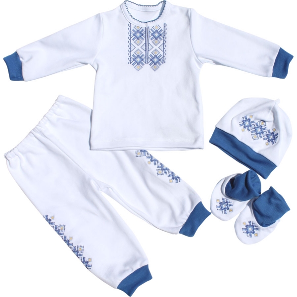 Костюм для хрещення хлопчика білий з національними мотивами. Манжети синього кольору. Включає в себе в себе все необхідне: кофту,штани, шапочку, пінетки. Виготовлений з тканини інтерлок, бавовна 100%. Прикрашений даний костюм оригінальною вишивкою . Усі деталі вишиті. Гіпоалергенний матеріал Подарунковий варіантКостюм для хрещення хлопчика білий з національними мотивами. Манжети синього кольору. Включає в себе в себе все необхідне: кофту,штани, шапочку, пінетки.