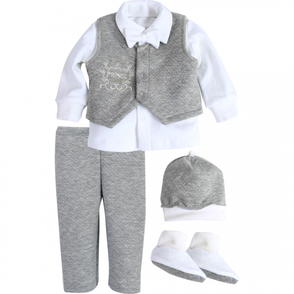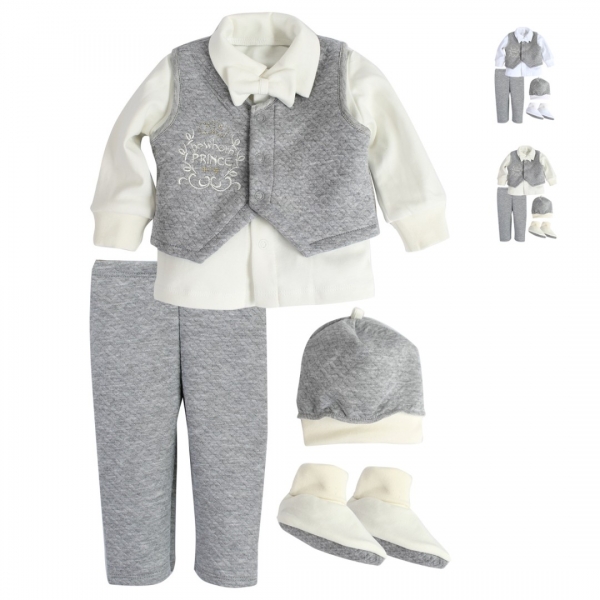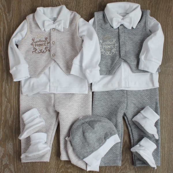 Святковий костюм для хлопчика «Newborn Prince». Виготовлений з тканини капітон (штаната, шапочка, камізелька ) та інтерлок (сорочечка та пінетки). У 80 розмірі пінетки відсутні. Представлений у двох варіантах з білою та молочною сорочечкою та комбінуванням. Прикрашений даний костюм оригінальною вишивкою з срібною ниткою.Нет описания