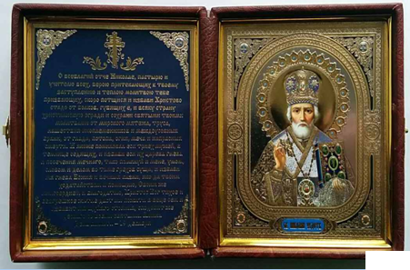 • Кожанный складень с молитвой,  лик 10х12 Софрино м-22-м 52 Невынимающийся молдинг, замочком и вышитым крестиком по средине, 32х13х6 см