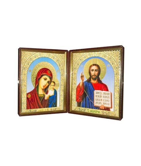 Кожаный складень не вынимающийся лик 10х12 Софрино арочный М-22-4 с молдингом, замочком и вышитым крестиком по средине, 32х13х6 см